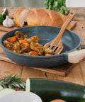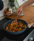 Our first edition cookware features recycled aluminium construction with wooden-look handles and screw fittings. To maintain their quality, we recommend hand washing, drying thoroughly after washing and avoiding long exposure to moisture.